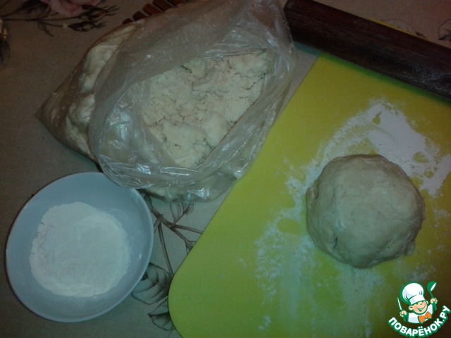 Взять часть теста и сжать, должен получится комок. Вот его и начинаю раскатывать. Примерно до толщины 5-7 мм.