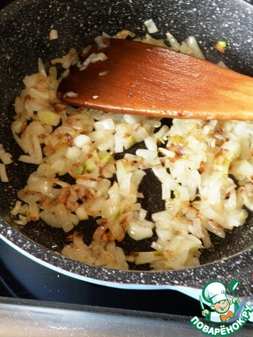 • Лук нашинковать и поджарить до золотистости. Остудить.