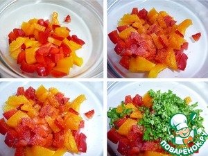 Готовим соус-заправку. Красный и желтый перец нарезать небольшими кубиками. Добавить красный жгучий перец, чесночный порошок, лимонный сок, сахар, оливковое масло и измельченную петрушку. В оригинале нужна кинза, у нас ее нет.