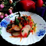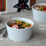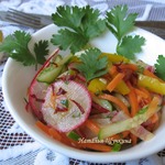 Предлагаю салат из моркови, огурца, редиса с замечательной овощной заправкой. Салат сочный, пикантный, напоминает вкус китайского салата. Идея рецепта встретилась в инете.