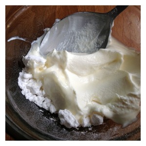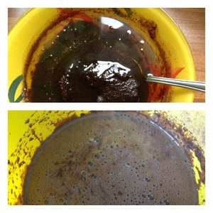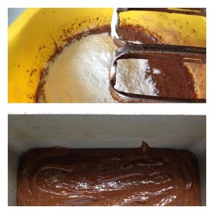 Черемуховую муку залить крутым кипятком. Перемешать и оставить пока в сторонке. В чашке взбить яйца с сахаром и какао на больших оборотах миксера в течение 1 минуты.