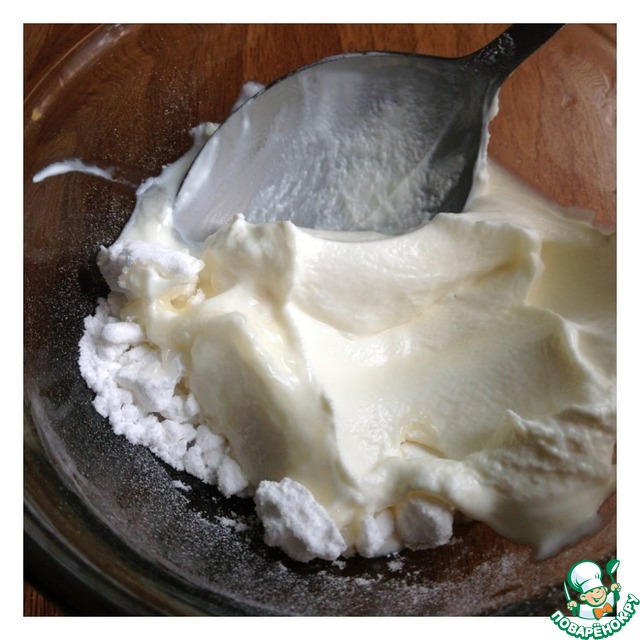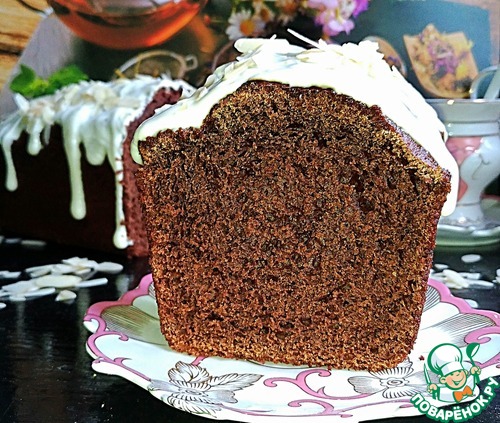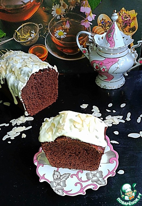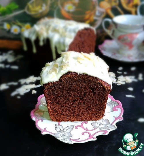 Готовый кекс остудить и залить сметанным кремом-заливкой. Для этого взбить сметану с сахарной пудрой. Сверху на сметанную заливку при желании выложить миндальные лепестки.