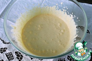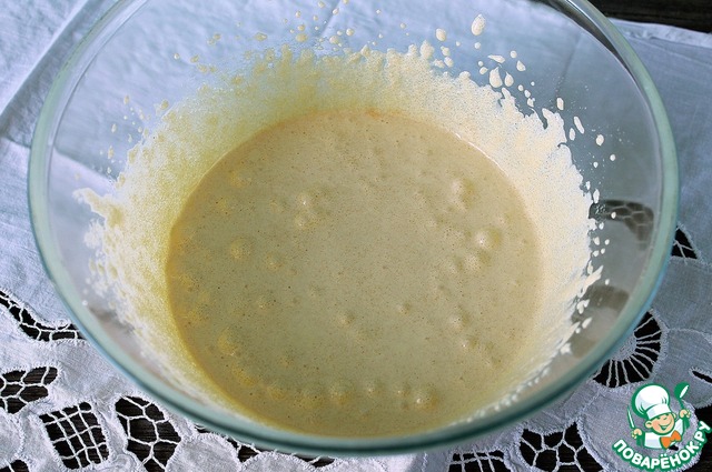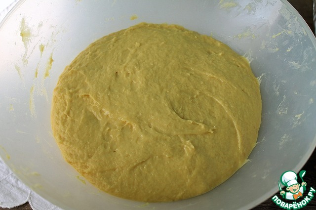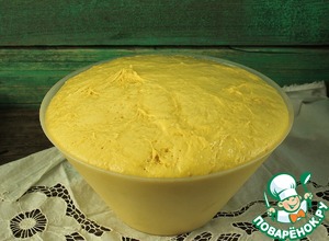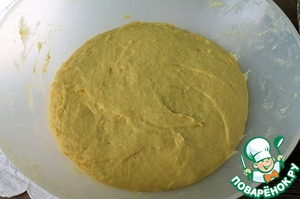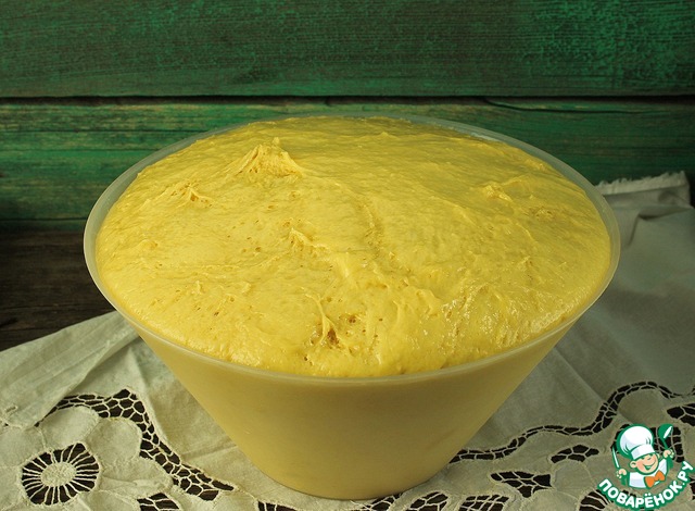 Отдельно желтки растираем с сахаром, солью и ванилином. Для цвета я добавила куркуму. Массу добавляем к опаре. -