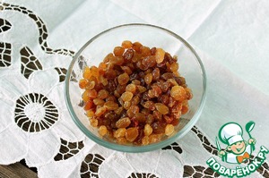 Изюм я предварительно промыла и замочила в коньяке (2 ч. л.). Изюм просушить на салфетке и обвалять в муке.