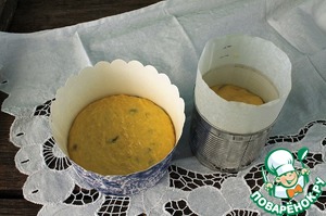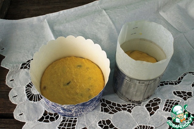 Я использовала в качестве форм покупные бумажные формы (толстые) и жестяные банки, кстати, в банках мне понравилось больше. Банки я предварительно смазала сливочным маслом и застелила бумагой для выпечки.