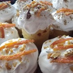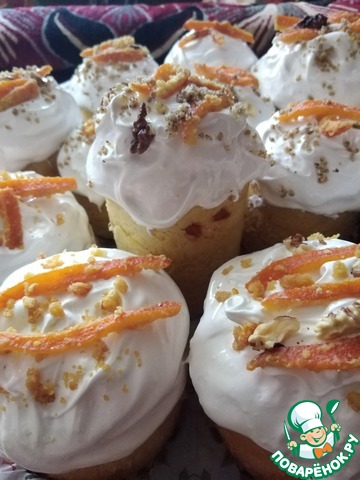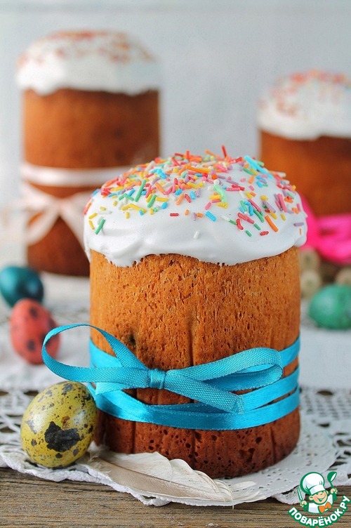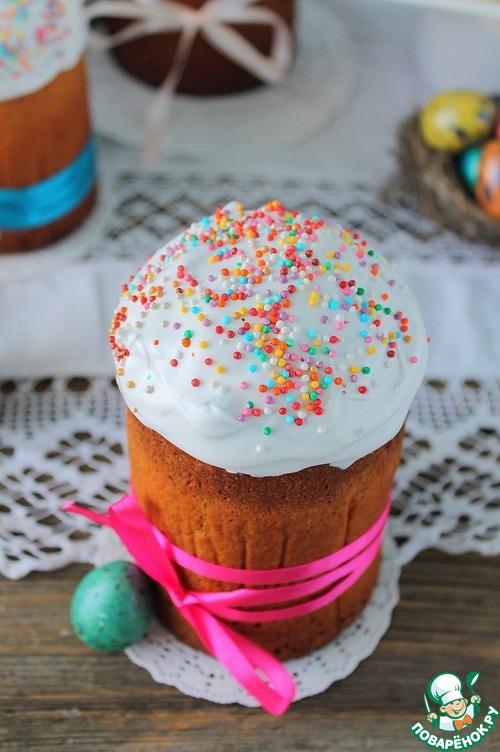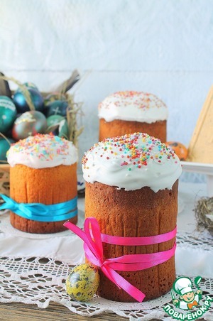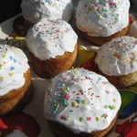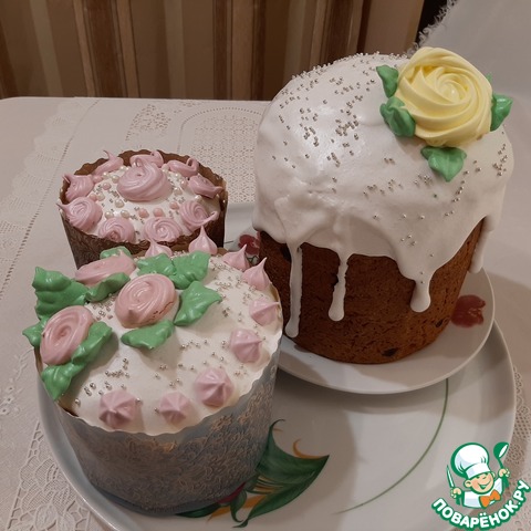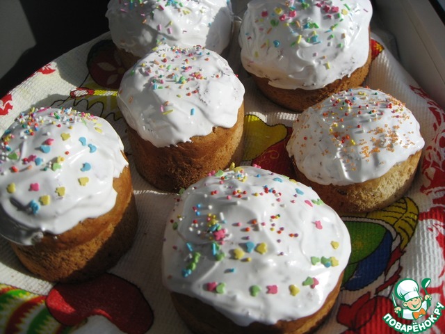 Остывшие куличи украшаем глазурью. Я делала самую простую: 2 яичных белка взбила с щепоткой соли и постепенно добавила сахарную пудру (на глаз), в самом конце добавила чайную ложку лимонного сока.