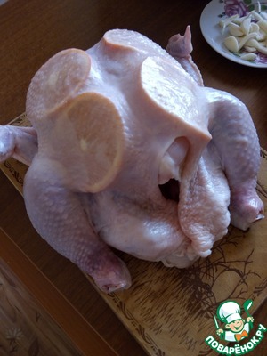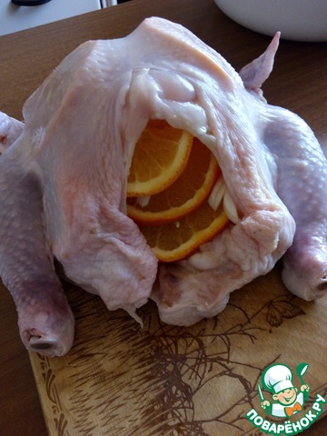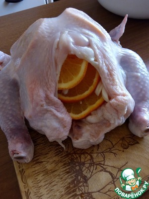 Оставить 7-8 кружочков апельсина, остальные вложить внутрь курицы вместе с чесноком.
