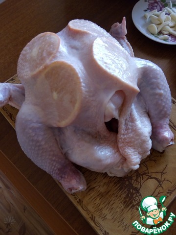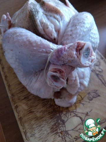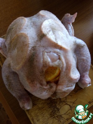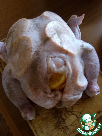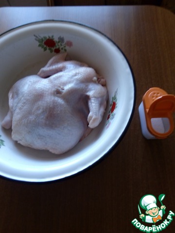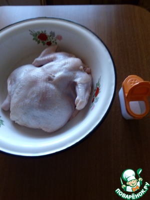 Курицу вымыть, обсушить. Натереть солью снаружи и внутри.