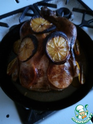 Готовую курицу достаем из духовки. подгоревшие апельсины снимаем.