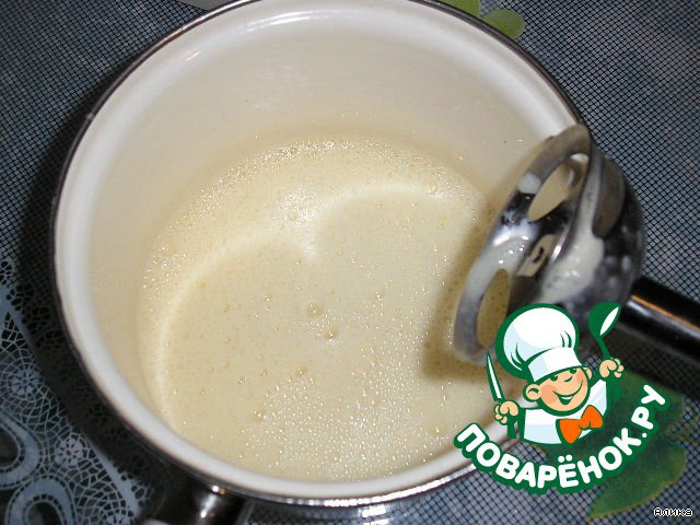 Влить в маргарин с черемухой яично-молочную смесь, взбить.