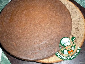Уложить, чередуя цвет пропитанные коржи, начиная со светлого. Смазать каждый корж сметанным кремом вместе с верхним.