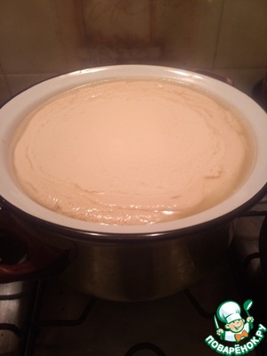 Ряженку выливаете в кастрюлю или миску, ставите вариться на водяную баню и забываете про неё на 1-2 часа