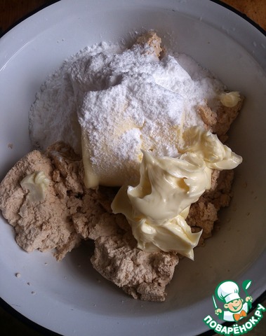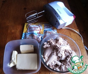 Теперь берете сливочное масло комнатной температуры, сахарную пудру и наш творог. У меня тут на фото двойной объём:)