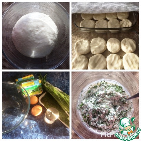 • Миску и тесто смазываем небольшим количеством растительного масла и оставляем отдыхать минут на 15. Затем делим тесто на кусочки, примерно с куриное яйцо, приминаем в виде лепешек, смазываем растительным маслом тщательно, накрываем полотенцем и оставляем минут на 20. Пока тесто отдыхает, готовим творожную начинку. Творог солим по вкусу, добавляем 2 яйца, тщательно перемешиваем. Моем и режем укроп и зеленый лук, добавляем к творогу. Творожная начинка готова.