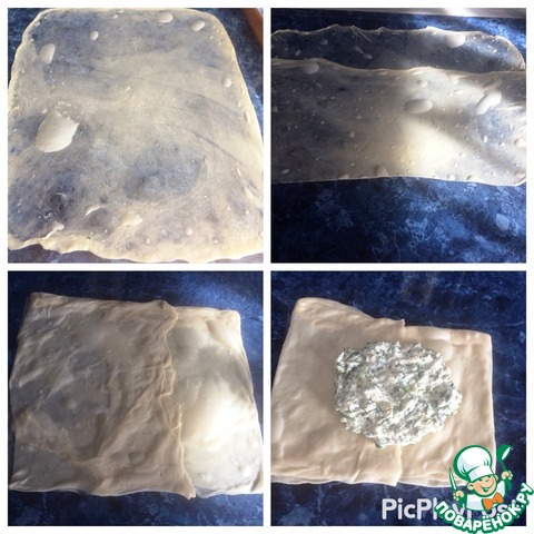 • Лепешку раскатываем на рабочей поверхности, смазанной растительным маслом. Тесто податливое, и его легко растянуть руками. Аккуратно растягиваем в прямоугольник. Сбрызгиваем растительным маслом. Начинаем складывать тесто. Сначала берем аккуратно близлежащие концы и складываем их к середине. Затем противоположные концы накладываем сверху. Получаем длинный прямоугольник. Сбрызгиваем немного маслом и теперь уже складываем тесто в квадрат, укладывая тесто к середине с боков. На фото, мне кажется, лучше виден процесс. Распределяем в центре творожную начинку.