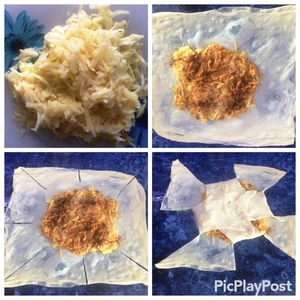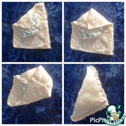 • Теперь начинку нужно закрыть тестом. Можно это сделать разными способами. На фото я попыталась показать разные варианты. Самый простой это сложить треугольником и вилочкой защепить края. Можно конвертиком.