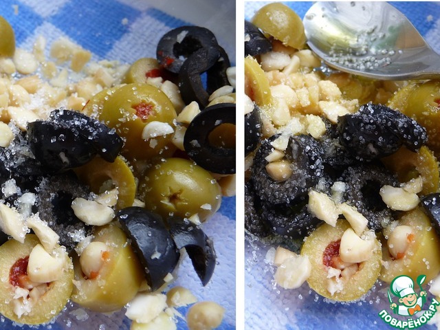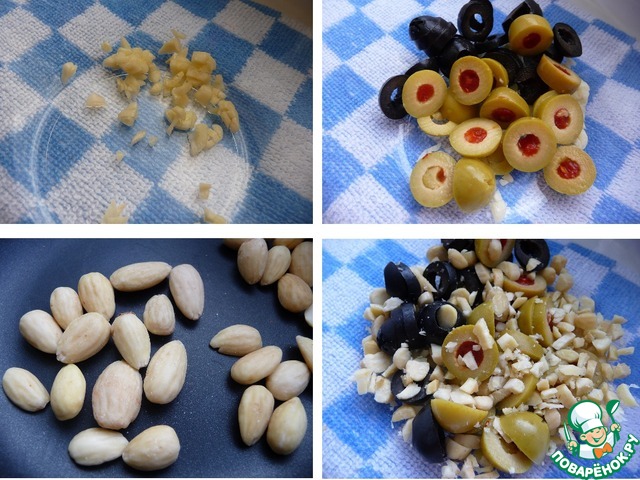 Приготовить соус- заправку. Чеснок очистить и измельчить. Маслины и оливки нарезать кольками. Миндаль подсушить на сухой сковороде и порубить ножом в крошку.