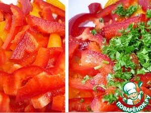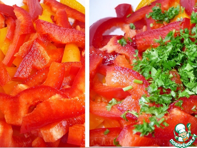 Перцы нарезать тонкой соломкой. Добавить измельченную петрушку.