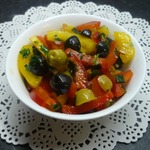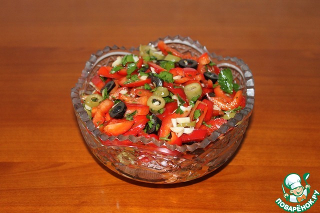 Предлагаю рецепт из сладкого перца с острой заправкой (автор Елена Тарантина). Салат можно использовать как гарнир к мясу, птице, рыбе, но и как самостоятельное блюдо. Время указано только на приготовление, без учета охлаждения салата.
