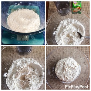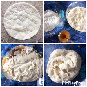 Спустя три часа замешиваем тесто. В большую миску просеять муку, всыпать соль, сахар, влить горчичное масло (у меня кунжутное масло) и оставшуюся теплую воду (40 мл). Добавляем всю опару и замешиваем тесто. Возможно, нужно будет подсыпать немного муки, чтобы сформировать колобок. Тесто получается мягкое и липнущее. Муки больше не добавляем. Я соединила воду, масло, соль и сахар в стакане, хорошо все перемешала и тогда влила в муку и добавила опару (я так решила сделать, как правильно, не знаю).