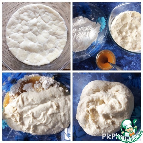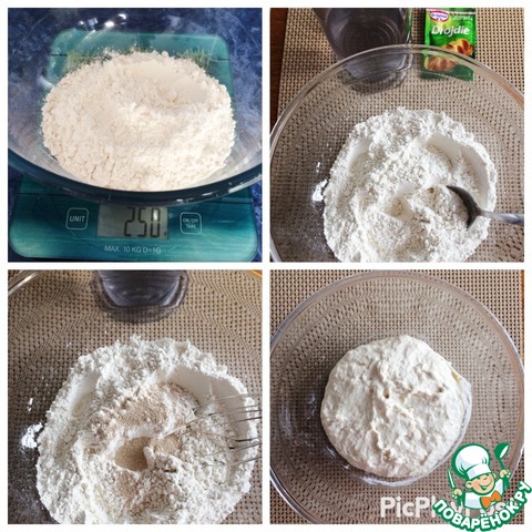 Готовим опару: 250 г муки просеять в миску, всыпать дрожжи, перемешать. Влить теплую воду (250 мл), замесить тесто — это и есть опара. Накрыть миску чистым полотенцем и поставить в теплое место на 3-3,5 часа (я в теплую духовку поставила).
