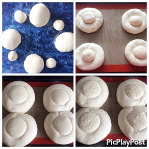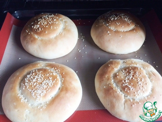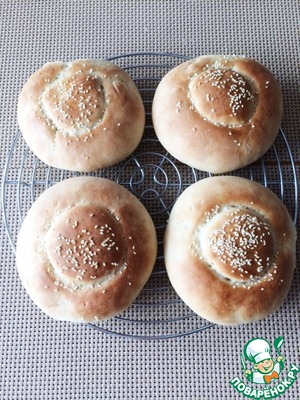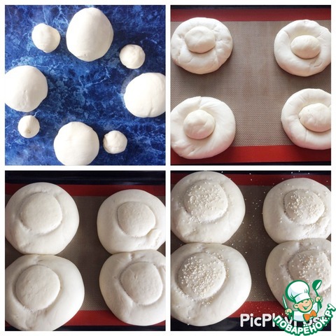 Все кусочки подкатываем в шарики, накрываем чистым полотенцем и оставляем в теплом месте на 10 минут. Далее в больших частях с помощью стаканчика выдавливаем углубление в центре и в каждое углубление помещаем маленький шарик. Булочки выкладываем на противень. Накрыть булочки полотенцем и оставить в теплом месте для расстойки на 1 час 30 минут. Нужно выкладывать булочки на расстоянии друг от друга не менее 10 см. Булочки очень вырастают в объеме. Перед выпечкой арнауты обязательно сбрызнуть водой, я еще посыпала кунжутом.