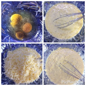 Готовим заливку. Яйца взбить, добавить сметану, посолить, поперчить по вкусу и добавить тертый сыр, оставив немного для верха пирога.