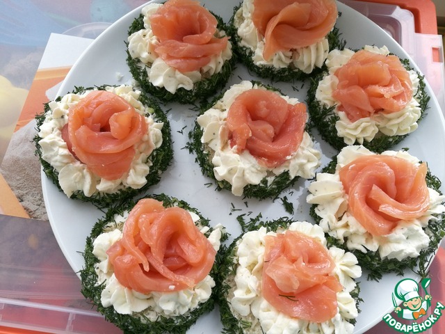 Теперь спатулой/ложкой обмазываем «бочка» хлебных дисков кремом и обваливаем их в измельченном укропе. Затем при помощи кулинарного мешка и насадки, какой вам больше нравится, выкладываем крем на бутерброд и украшаем розочкой из рыбы. Отправляем в холодильник на час-два. Добавим листики петрушки для красоты и подаем к столу. Приятного аппетита!