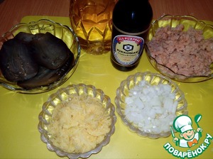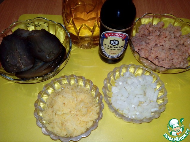Ломтики баклажана бланшировать в подсоленной воде минут 5. Обсушить бумажным полотенцем. Картофель натереть на мелкой терке, отжать. Репчатый лук мелко нарезать и обжарить на подсолнечном масле с добавлением кунжутного масла. В рыбный фарш добавить натертый картофель, обжаренный лук и 1-2 ст. л соевого соуса Kikkoman (по вкусу)
