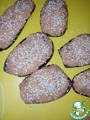 На ломтики баклажан ложкой равномерно нанести фарш, посыпать кунжутом.