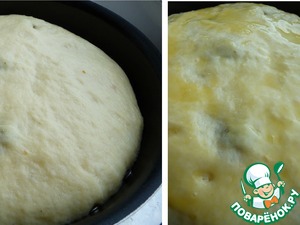 Подошеднее тесто можно смазать взбитым яйцом (это не обязательно), делать очень аккуратно, чтобы не потревожить тесто.
