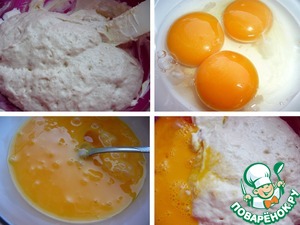 Через 45мин. опара готова, добавить ее в миску для замеса. Яйца взбить вилкой и добавить в миску.