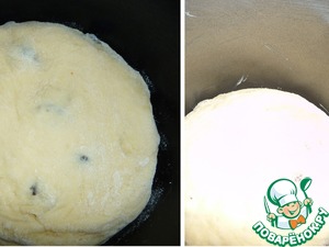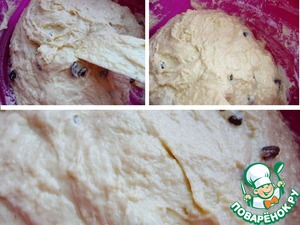 Изюм перемешать с тестом, на край теста добавить растительное масло и хорошо вымесить тесто лопаткой. Миску закрыть крышкой и убрать в теплое место на 1-1,5часа.