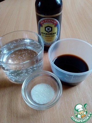 Приготовить маринад: смешать газированную воду, соевый соус Kikkoman и сахар.