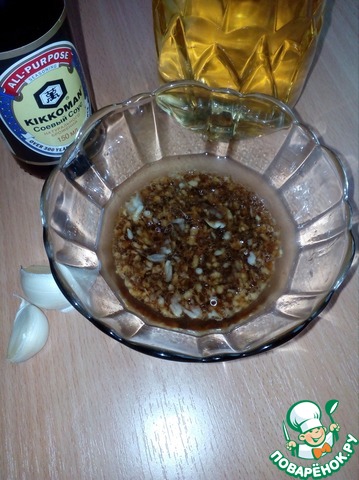Из растительного масла, соевого соуса и измельченного чеснока приготовим заправку.