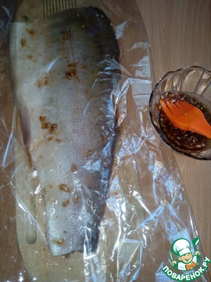 Горбушу вынуть из маринада, обсушить бумажным полотенцем. Поместить в пакет для запекания. Кулинарной кистью смазать кожу горбуши заправкой.