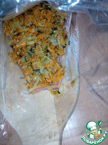 Пакет с рыбой перевернуть кожей вниз, сверху равномерно распределить обжаренные овощи.