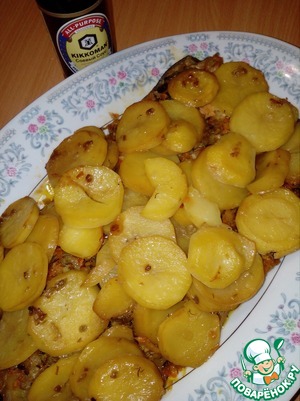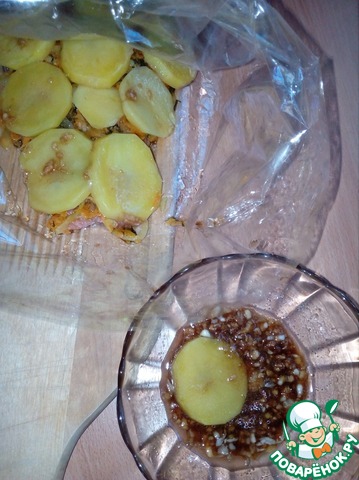 Поверх обжаренных овощей разложить ломтики отварного картофеля, предварительно обмакивая их в заправке.