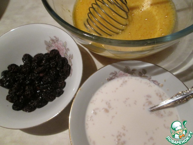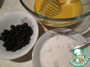 Хочу предупредить, что во времени приготовления указано только время выпечки. Куличи в общей сложности готовятся около 12 часов, но от вас в процессе приготовления не понадобится ничего, кроме усидчивочти. Итак, приступим. Обдайте изюм кипятком, залейте коньяком или бренди. Дрожжи растворите в теплом молоке, яйца взбейте венчиком до однородности.