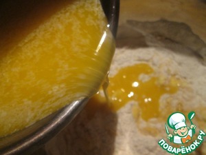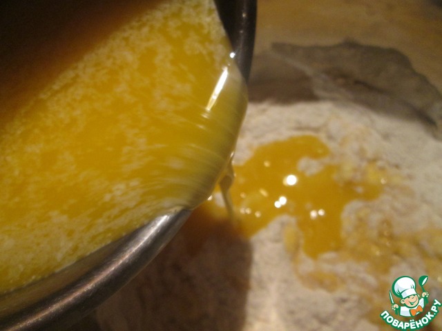 Муку просейте, смешайте с сахаром и солью, растопите и слегка остудите сливочное масло. Смешайте муку с дрожжевой смесью, влейте сливочное масло. Перемешайте тесто ложкой.
