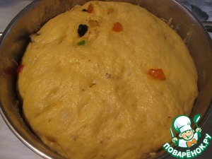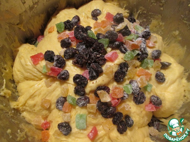 После шести " складываний " добавьте в тесто отжатый и просушенный изюм, смешанный с цукатами, пряностями. Добавки можно немного припылить мукой, чтобы они более равномерно распределялись по тесту. Все хорошо перемешиваем, накрываем емкость с тестом и убираем ее в холодильник минимум на 8 часов, максимум на 48.