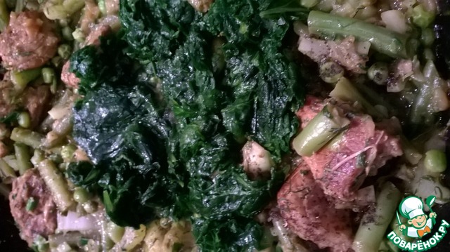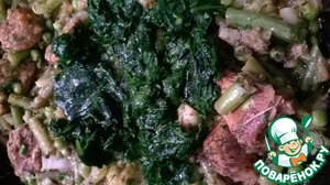 • Сельдерей, шпинат и оставшуюся зелень добавить к мясу, соль, перец, кориандр молотый по вкусу, протушить еще минут 5. Вот и все готово.