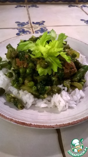 Для тех, кто любит зелень в любом виде. Если заменить свинину на курицу или индейку, смело можно назвать его диетическим. Ароматы трав и сельдерея очень улучшают вкус мяса, а зеленый горошек дает сладость. Попробуйте приготовить, это еще и по весеннему.