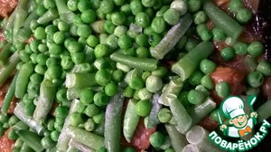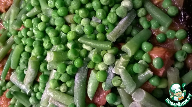 • Добавить стручковую фасоль и зеленый горошек. Протушить в течении 7-10 мин.