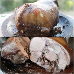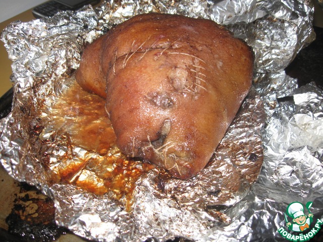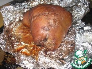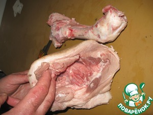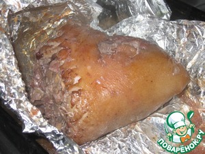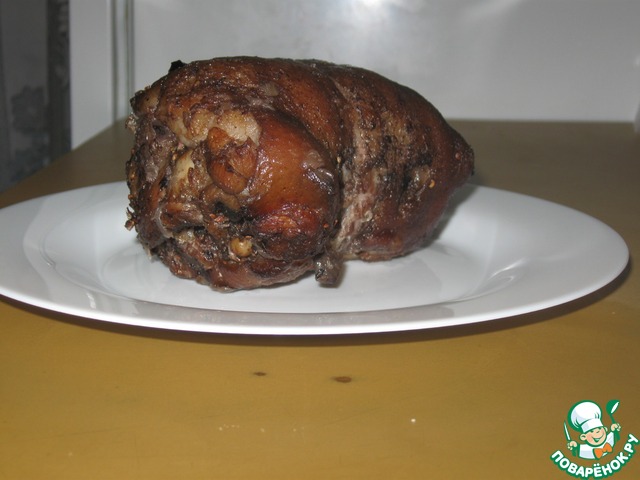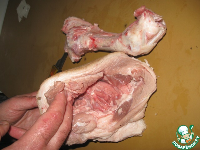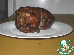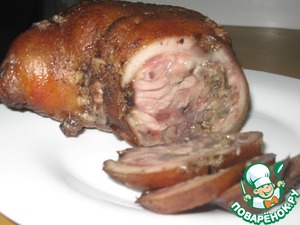 Рульку моем, скоблим. Осторожно, стараясь не повредить кожу, вынимаем кость. Смешиваем все ингредиенты для маринада, подогреваем его до 36,6 градусов (температура тела). Рульку заливаем теплым маринадом и оставляем при комнатной температуре на 1 час.