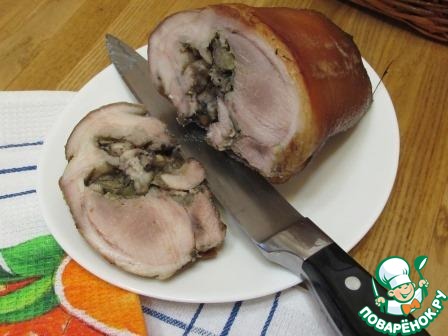 Рульку защиваем с узкой части, фаршируем грибами с луком и малиной, зашиваем с широкой части. Заворачиваем в фольгу и запекаем при 160 градусах 2 часа (у готовой рульки при проколе выделяется прозрачный сок).