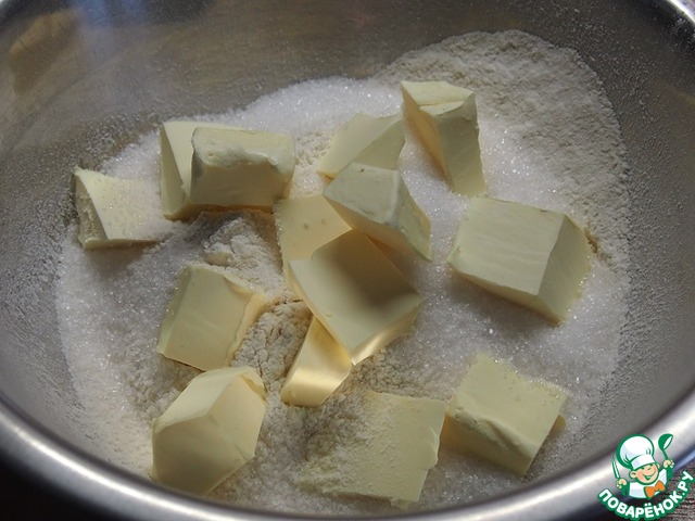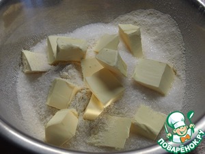 К просеянной муке добавить щепотку соли, сахар, масло, порезанное на кусочки. Пальцами сделать крошку.