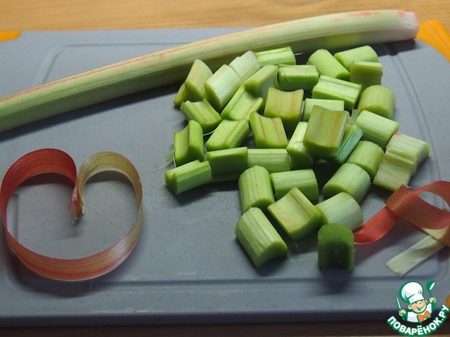 Нарезанный ревень сложить в миску, добавить к нему коричневый (можно и обычный) сахар и натертый на мелкой терке имбирь. Перемешать. Имея в виду, что ревень кислый, сладкоежки могут добавить еще одну ложку сахара.
