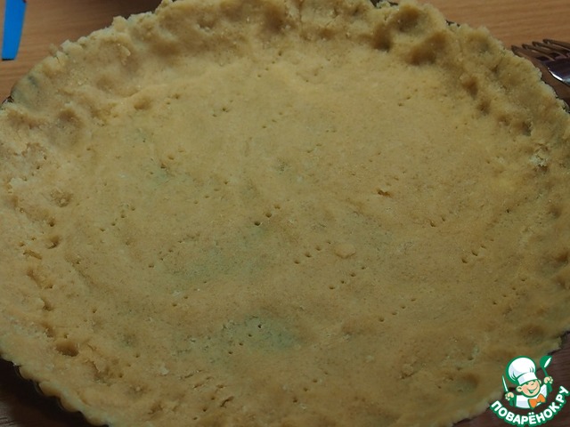 Форму для выпечки смазать маслом. Достать тесто из холодильника и распределить его по форме, сделав бортики. Вилкой сделать в тесте проколы.