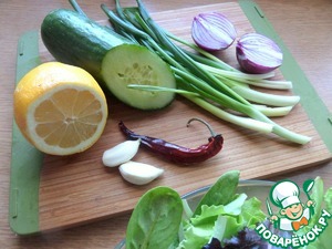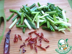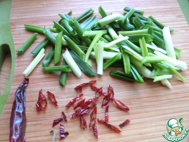 Лук зелёный нарезать не мелко. Чили у меня сухой, настрогать мелко.